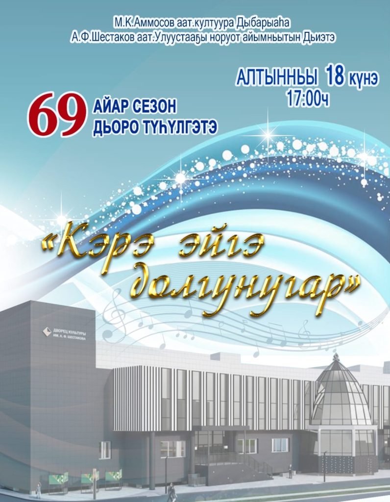 Алтынньы 18 күнүгэр Афанасий Шестаков аатынан Улуустааҕы норуот айымньытын Дьиэтэ 69-с үлэ сезонун арыйар дьоро киэһэтэ. Тэтимнээх айар үлэни саҕалыыр үөрүүлээх тэрээһиҥҥэ Нам улууһун бары олохтоохторун уонна ыалдьыттарын ыҥырар!